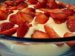 Quebre grosseiramente os biscoitos e monte as camadas de biscoitos regados com a calda obtida do cozimento dos morangos.